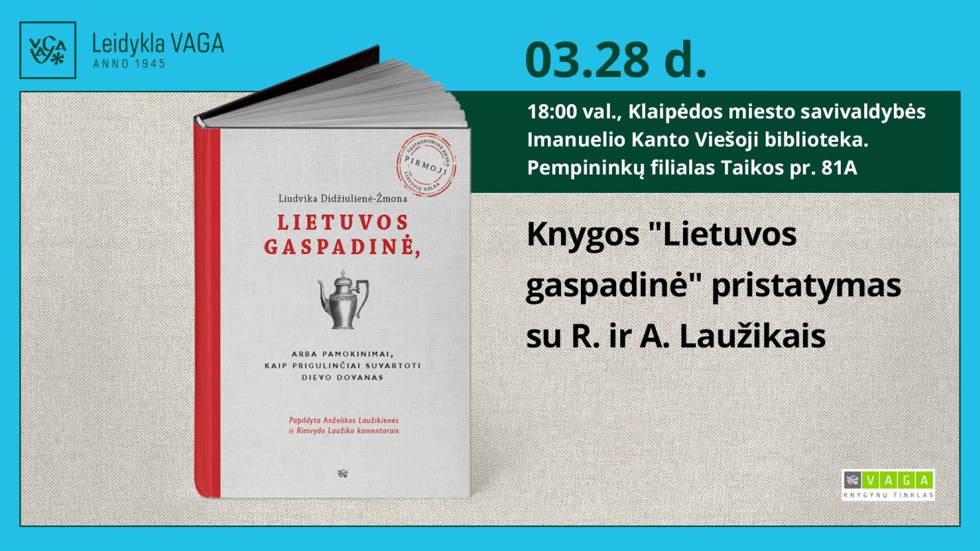 Kovo 28 d. 18.00 val. Klaipėdos miesto savivaldybės Imanuelio Kanto viešosios bibliotekos Pempininkų padalinyje (Taikos pr. 81A) kviečiame į Liudvikos Didžiulienės-Žmonos knygos „Lietuvos gaspadinė, arba Pamokinimai, kaip prigulinčiai suvartoti Dievo dovanas“, papildytos Rimvydo Laužiko ir Anželikos Laužikienės komentarais, pristatymą.
