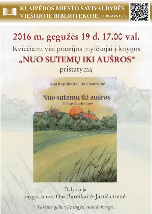 Kviečiame visus poezijos mylėtojus į knygos „Nuo sutemų iki aušros” pristatymą. Dalyvauja knygos autorė Ona Bareikaitė-Jarušaitienė.