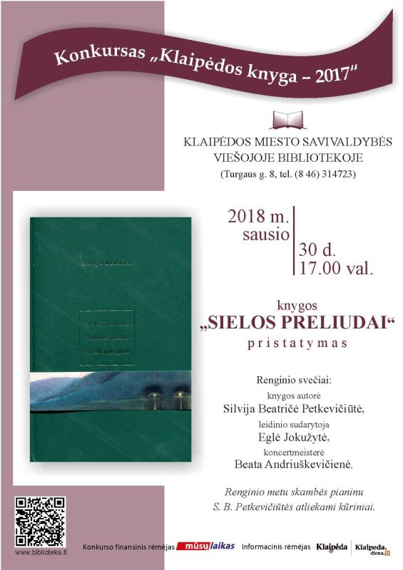 Kviečiame į konkurso „Klaipėdos knyga – 2017“ renginį – knygos „Sielos preliudai“ pristatymą. Leidėjas – VšĮ „Verslas ar menas“. Renginio svečiai: knygos autorė Silvija Beatričė Petkevičiūtė; leidinio sudarytoja Eglė Jokužytė; koncertmeisterė Beata Andriuškevičienė. Renginio metu skambės pianinu S. B. Petkevičiūtės atliekami kūriniai.