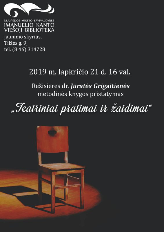 Lapkričio 21 d. 16 val. Klaipėdos miesto savivaldybės Imanuelio Kanto viešosios bibliotekos Jaunimo skyriuje (Tilžės g. 9) kviečiame į Klaipėdos universiteto dėstytojos, teatrogės, režisierės dr. Jūratės Grigaitienės metodinės knygos „Teatriniai pratimai ir žaidimai“ pristatymą.