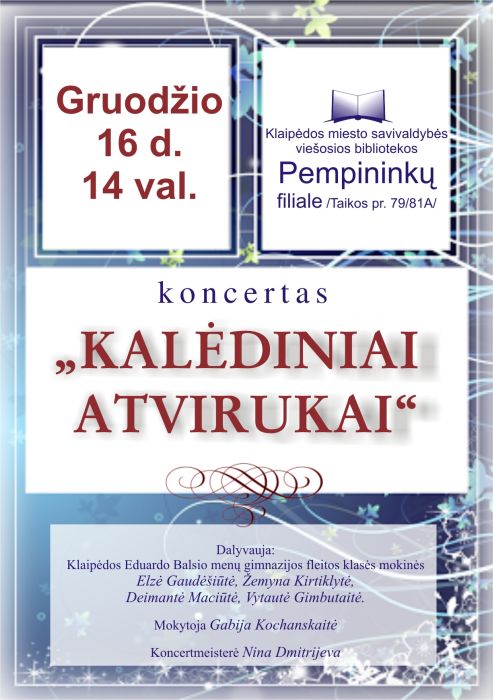 Kviečiame į koncertą „Kalėdiniai atvirukai”. Dalyvauja Eduardo Balsio menų gimnazijos fleitos klasės mokinės: Elzė Gaudėšiūtė, Žemyna Kirtiklytė, Deimantė Maciūtė, Vytautė Gimbutaitė. Mokytoja Gabija Kochanskaitė. Koncertmeisterė Nina Dmitrijeva.