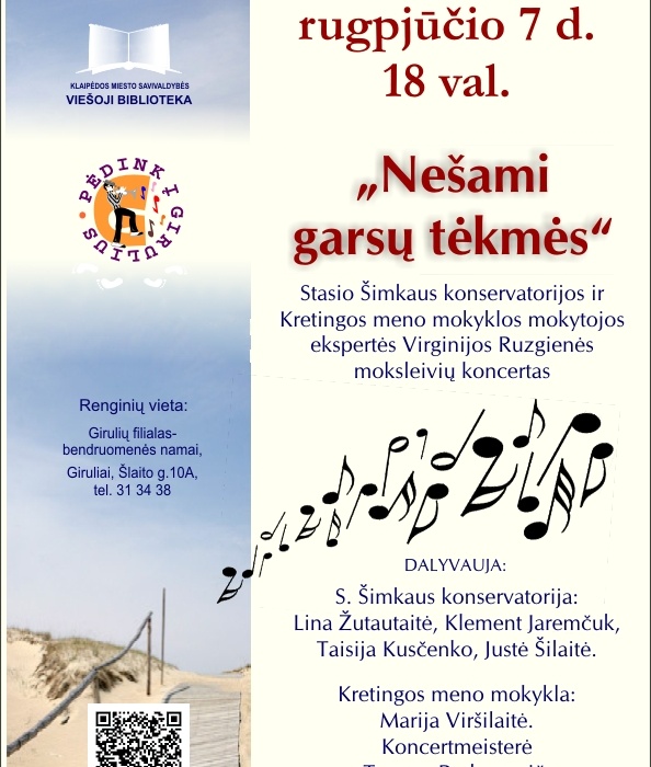 Kultūrinių renginių programoje „Pėdink į Girulius” rugpjūčio 7 d. 18 val. Stasio Šimkaus konservatorijos ir Kretingos meno mokyklos mokytojos ekspertės Virginijos Ruzgienės moksleivių koncertas „Nešami garsų tėkmės”.