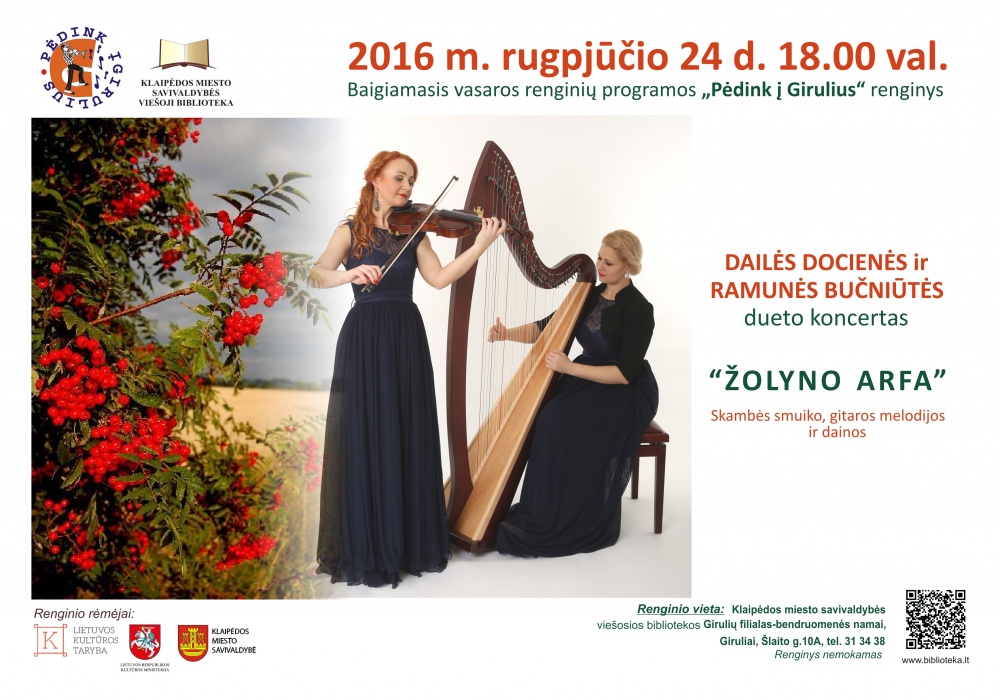 Kviečiame į baigiamąjį 2016 m. vasaros renginių programos „Pėdink į Girulius” vakarą: Dailės Docienės ir Ramunės Bučniūtės dueto koncertą „Žolyno arfa”. Renginio metu skambės smuiko, gitaros melodijos ir dainos, lauks pažintis su arfa.