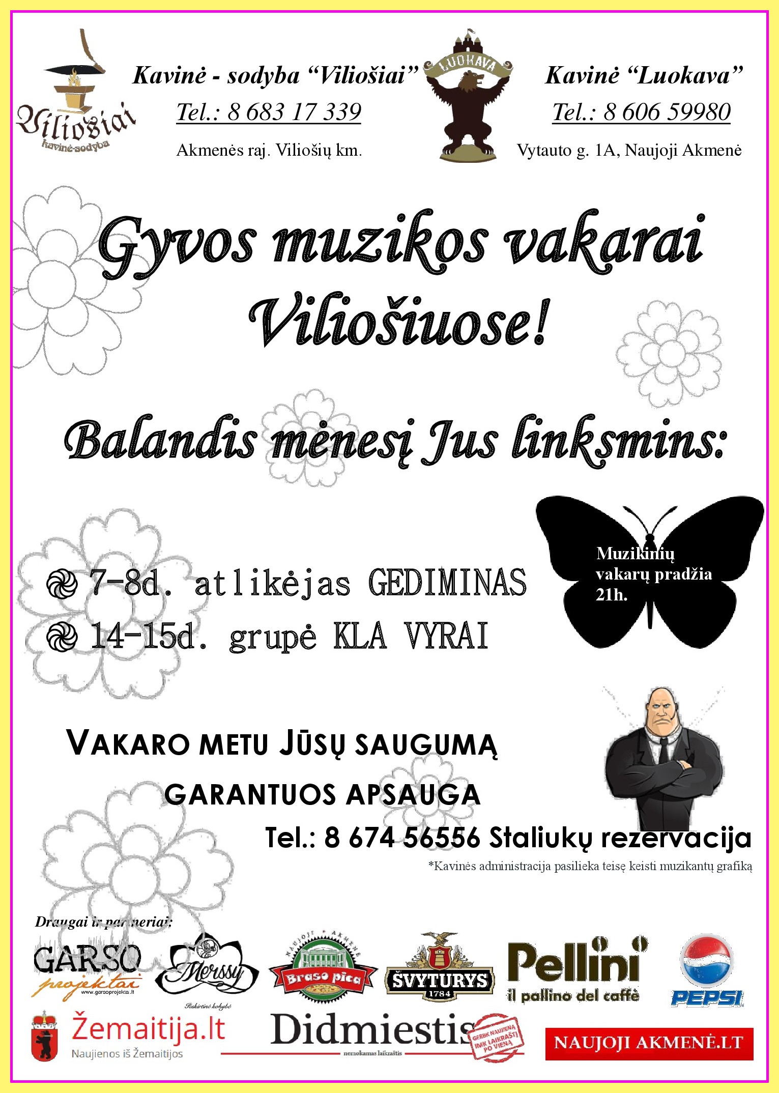 Vakaro metu jus linksmins atlikėjas Gediminas. Staliukų rezervacija išankstinė. Gera nuotaika, puikus laikas garantuotas!