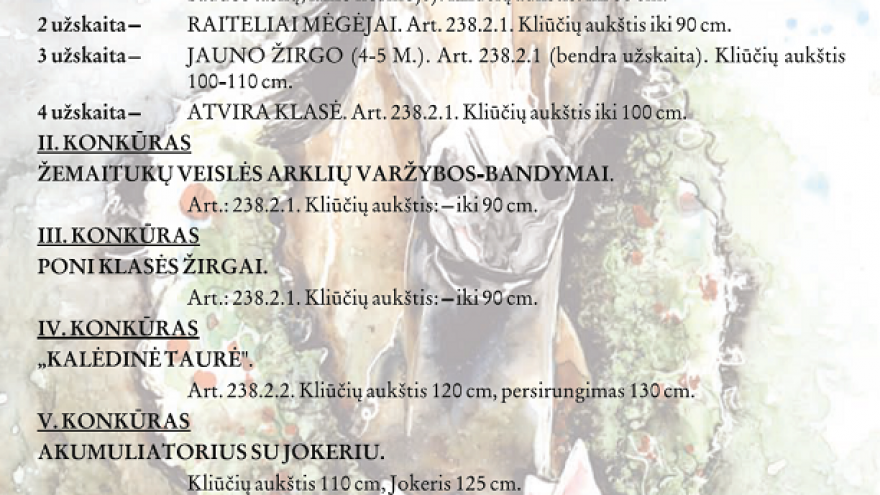 Kalėdinėse varžybose raiteliai kviečiami dalyvauti su šventinėmis kaukėmis, papuoštais žirgais – renginio metu rinksime originaliausiai pasipuošusį duetą. Varžybų žiūrovams pažadame staigmenas ir karštą arbatą.