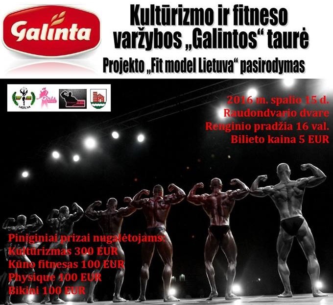 Kultūrizmo ir fitneso varžybos – kultūrizmas, kūno fitnesas, physique ir bikini. Projekto “Fit model Lietuva” pasirodymas. Daugiau informacijos: http://www.ifbb.lt/images/galinta_taure.pdf