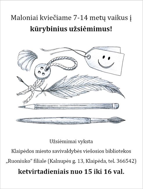 Maloniai kviečiame 7-14 metų vaikus į kūrybinius užsiėmimus! Užsiėmimai vyksta Klaipėdos miesto savivaldybės viešosios bibliotekos„Ruoniuko” filiale (Kalnupės g. 13, tel. 366542) ketvirtadieniais nuo 15 iki 16 val.