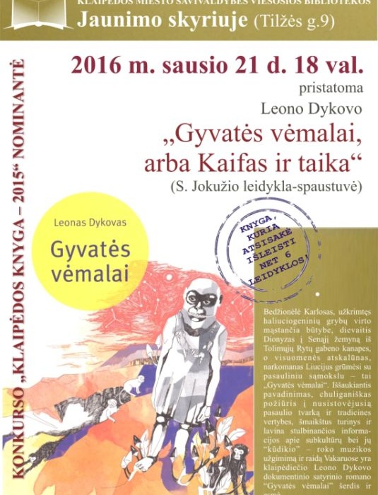 Kviečiame į konkurso „Klaipėdos knyga – 2015″ nominantės Leono Dykovo knygos „Gyvatės vėmalai, arba Kaifas ir taika” (S. Jokužio leidykla-spaustuvė) pristatymą. Tai knyga iššaukiančiu pavadinimu, kurią atsisakė išleisti net 6 leidyklos.