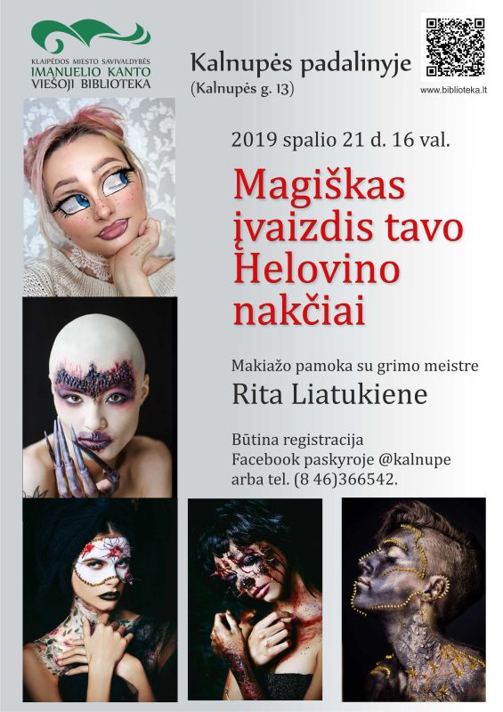 2019 spalio 21 d. 16 val. Klaipėdos miesto savivaldybės I.Kanto viešosios bibliotekos Kalnupės padalinys (Kalnupės g. 13) kviečia į makiažo pamoką „Magiškas įvaizdis tavo Heloweeno nakčiai“ su grimo meistre Rita Liatukiene, kuri dirba grožio srityje, kuria įvaizdžius, bendradarbiauja su fotografais įvairiuose projektuose. Yra laimėjusi prizines vietas foto konkursuose 2018-2019 metais „Metų visažistas“. Galite atsinešti savo kosmetikos priemones ir su meistrės pagalba pasimokyti atlikti Heloweeno įvaizdį sau.