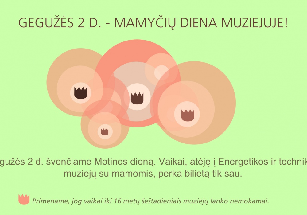 Gegužės 2 d., šeštadienį, Energetikos ir technikos muziejuje (Rinktinės g. 2, Vilnius) – mamyčių diena. Motinos dienos proga visi vaikai kviečiami į muziejų atsivesti mamas ir įsigyti bilietą tik sau.