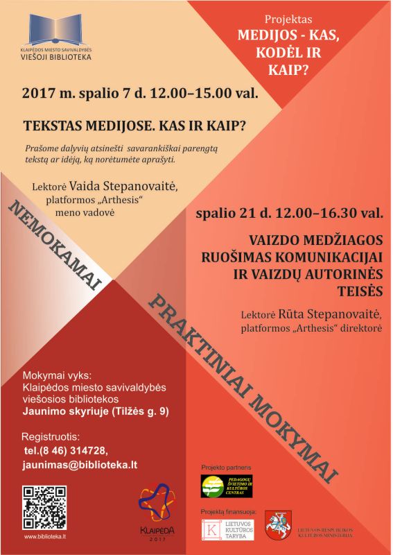 Klaipėdos miesto savivaldybės viešoji biblioteka įgyvendindama Lietuvos kultūros tarybos finansuojamą projektą „Medijos – kas, kodėl ir kaip?“, kartu su specialistais kviečia į nemokamus edukacinius užsiėmimus, medijų raštingumui stiprinti. Mokymai vyks Jaunimo skyriuje (Tilžės g.9), registruotis tel. (8 46) 314728.