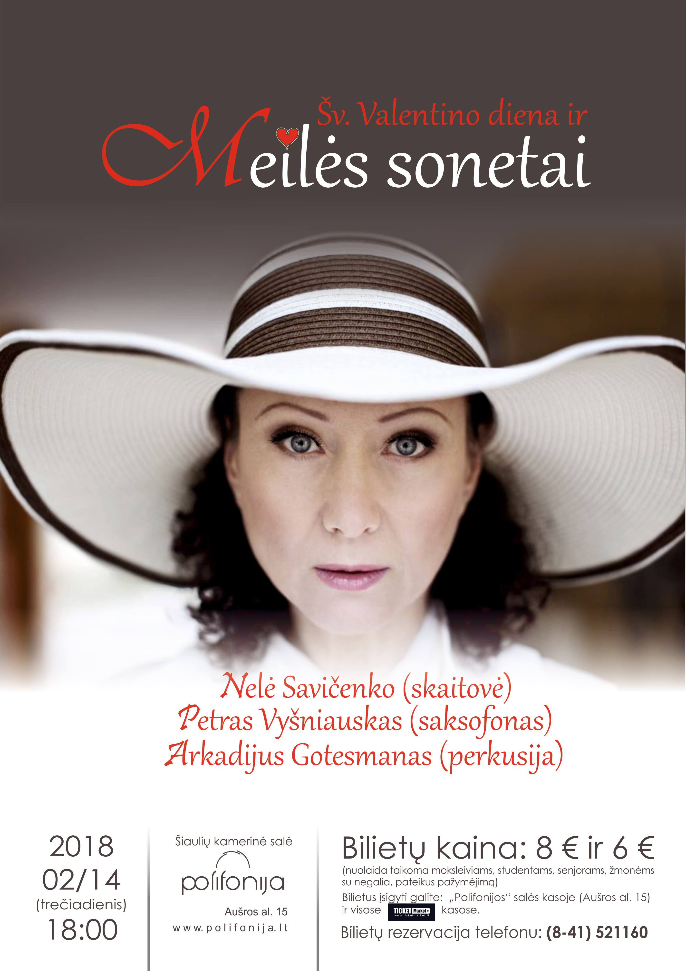 Meilės sonetų vakaras – šilta ir su meile paruošta programa, norintiems jaukiai praleisti vakarą su savo šeima ar mylimaisiais. Programoje išgirsime aktorės Nelė Savičenko skaitomas eiles, kurioms pritars džiazo virtuozo Petro Vyšniausko ir perkusininko Arkadijaus Gotesmano atliekama muzika.