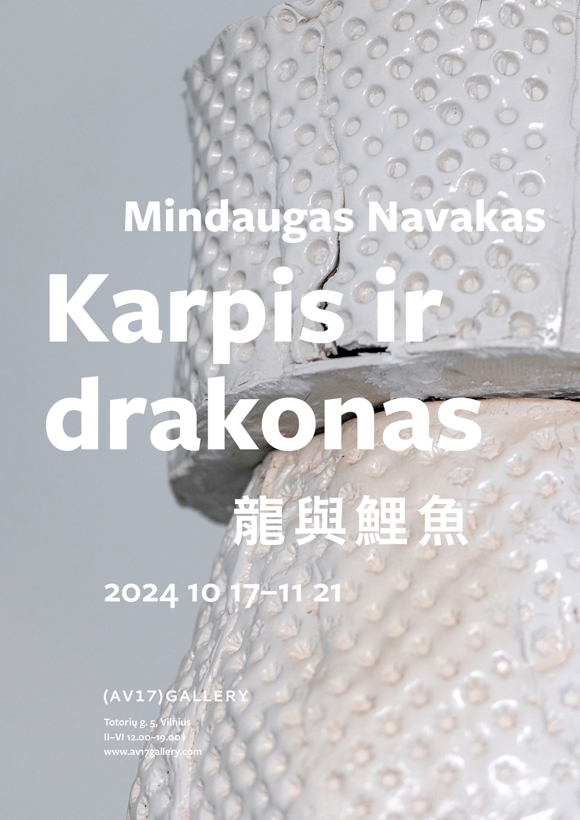 Mindaugo Navako personalinėje parodoje „Karpis ir drakonas“ pristatomi naujausi gyvojo klasiko kūriniai iš kietojo porceliano. Skulptūriniuose objektuose atsiskleidžia autoriui svarbūs medžiagiškumo sprendimai ir su tuo susiję sociokultūriniai klausimai. Menininkas iš ilgametes Rytų keramikos tradicijas turinčio kietojo porceliano kuria vakarietiškas formas primenančias struktūras, taip kūriniuose išryškindamas civilizacijų konfliktus, kultūros bei estetikos skirtumus. Su trapumu ir rafinuotumu siejamas porcelianas ironijos nevengiančio Mindaugo Navako skulptūrose yra supriešinamas su šios medžiagos panaudojimu kasdieninėje aplinkoje Vakarų pasaulyje. Tyrinėdamas filosofiją bei kurdamas pokalbį tarp dviejų polių – rytų ir vakarų, dangaus ir žemės, kultūros ir natūros – menininkas permąsto jų santykį bei abipuses įtakas, pastebi su tuo susijusias grėsmes. Netikėti skulptūriniai sprendimai kūriniuose sudaro įtampas, kuriose atsiskleidžia šiandien patiriamos neužtikrintumo, pavojaus, tradicijų laikinumo pajautos. Mindaugo Navako paroda „Karpis ir drakonas“ įtraukia žiūrovą bei skatina pastebėti Rytų ir Vakarų kultūrų identiteto skirtumus.