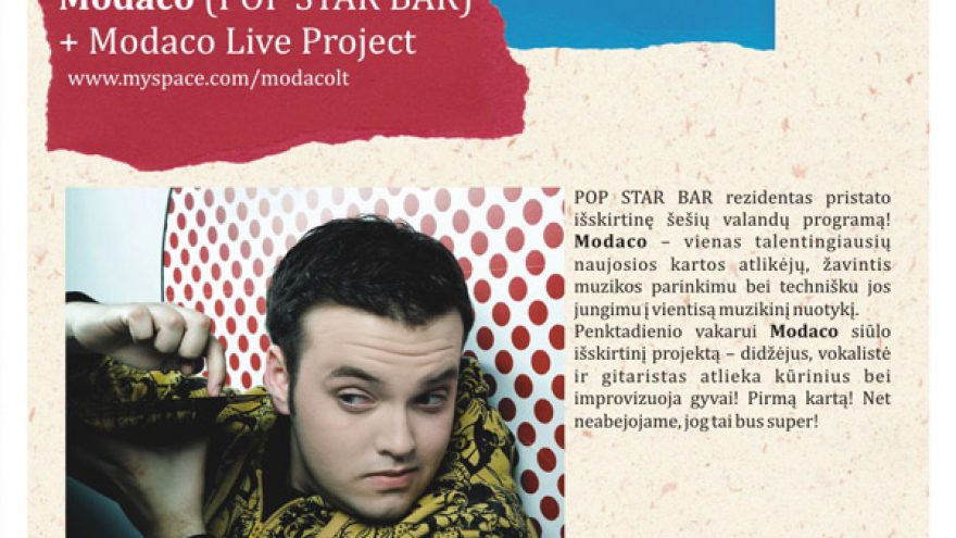 POP STAR BAR rezidentas pristato išskirtinę šešių valandų programą! Modaco – vienas talentingiausių naujosios kartos atlikėjų, žavintis muzikos parinkimu bei technišku jos jungimu į vientisą muzikinį nuotykį.