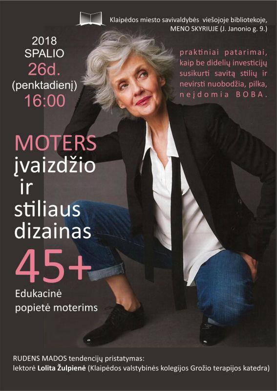 Spalio 26 d. 16.00 val. Klaipėdos miesto savivaldybės viešosios bibliotekos Meno skyriuje (J. Janonio g. 9) kviečiame į edukacinę popietę moterims „Moters įvaizdžio ir stiliaus dizainas 45+“.