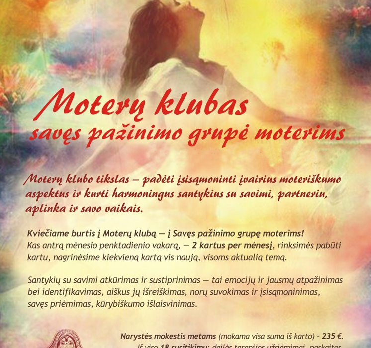 Visuose šiuose susitikimuose/užsiėmimuose dalyvauti gali tik Moterų klubo narės – nuo spalio mėnesio grupė bus uždara. Registruotis galima jau dabar. Registracija patvirtinama gavus apmokėjimą.