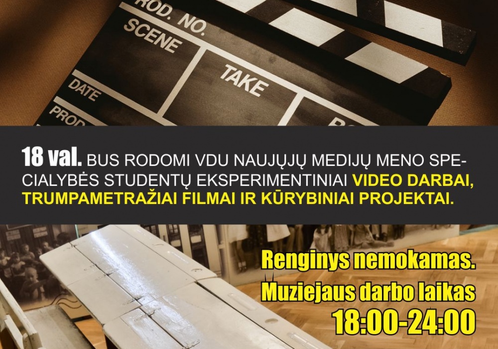 18 val. bus rodomi VDU Naujųjų medijų meno specialybės studentų eksperimentiniai video darbai, trumpametražiai filmai ir kūrybiniai projektai.