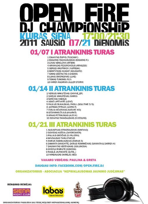 Ar nori pasikaitinti muzikiniais ritmais, šokiu, nesušalti nei šaltais žiemos vakarais ir išrinkti ugningiausią jaunimo Dj‘ėjų? Jei taip – keliauk į „Open fire“ vakarėlius! Nuo sausio 7 dienos, naktiniame klube SIENA startavo respublikinis DJ’ėjų atrankinis turas, dėl karščiausio jaunimo Dj‘ėjaus vardo ir didžiojo prizo. Dalyvauk ir smagiai praleisk laiką! Pasirodymus vertins garbinga komisija, klubo lankytojai bei visi tinklalapi…o facebook.com lankytojai. Pasiruošt, dėmesio, UGNIS! KOMISIJA