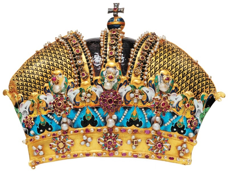 Jau 1630 m. minimos šešios skirtingos Marijos karūnos, kurių tik viena išliko iki šiol. Ji datuojama XVII a. pr. ir mena Benedikto Vainos arba Eustachijaus Valavičiaus klebonavimo Trakuose periodą. Antroji, auksinė, ypač puošni, emaliu, perlais ir brangakmeniais išdailinta Marijos karūna, manoma, buvo dovanota Sapiegų giminės XVII a. I pusėje. 1677 m. Vilniaus vyskupas Mikalojus Steponas Pacas garsiajam paveikslui užsakė sidabrinį auksuotą aptaisą – reto meistriškumo auksakalystės kūrinį. Jis pasiekė mūsų laikus netekęs vienos plokštės. Antrąjį išlikusį aptaisą, kuris ir dabar puošia paveikslą, 1723 m. nukalė Vilniaus auksakalys Jonas Frydrikas Šemnikas. Trakų bažnyčios lobyne aptinkame ne vieną šio garsaus menininko kūrinį: Šemniko plaktukui priklauso ir Trakų bažnyčios didžiojo altoriaus antepedijaus kalstiniai bei šešios altoriaus žvakidės. Nors meistras savo dirbinių nesignavo, jo unikalus braižas ir mėgstami augaliniai motyvai leidžia priskirti jam du relikvijorius bei vieną iš septynių išlikusių XVIII a. mišių taurių. Lobyno puošmena yra ir kito talentingo Vilniaus auksakalio Jono Lario sukurta ankstyviausia Lietuvoje rokoko stiliaus monstrancija, artima XVII a. pabaigos Augsburgo auksakalystės mokyklai.