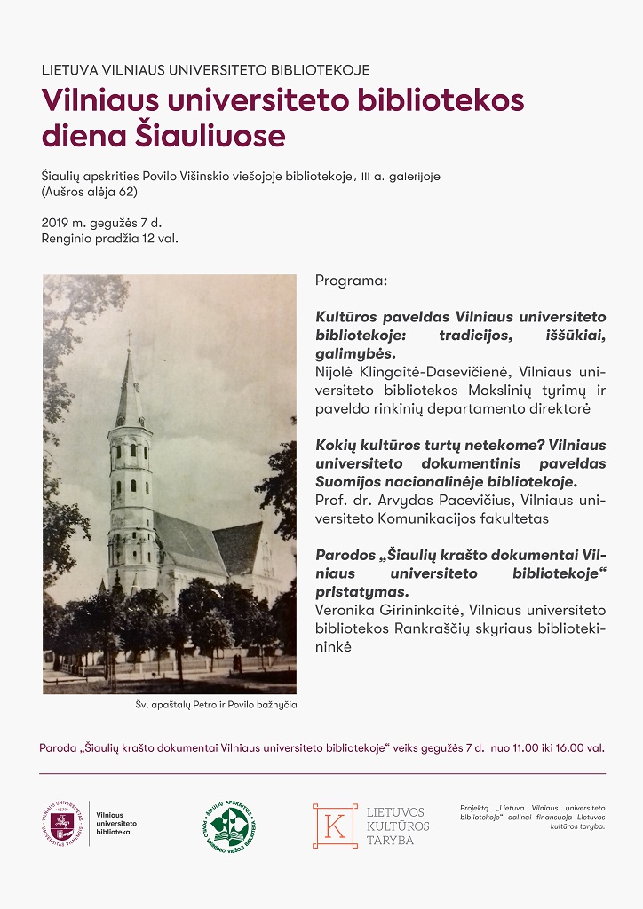 2019 m. gegužės 7 d. 12.00 val. Vilniaus universiteto biblioteka Šiaulių apskrities Povilo Višinskio viešojoje bibliotekos III a. galerijoje pristatys parodą „Šiaulių krašto dokumentai Vilniaus universiteto bibliotekoje“.