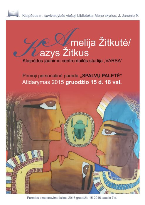 Atidaroma Klaipėdos jaunimo centro dailės studijos „Varsa” ugdytinių – Amelijos Žitkutės ir Kazio Žitkaus pirmoji personalinė paroda „Spalvų paletė”. Paroda veiks iki 2016 m. sausio 7 d. Kviečiame aplankyti!