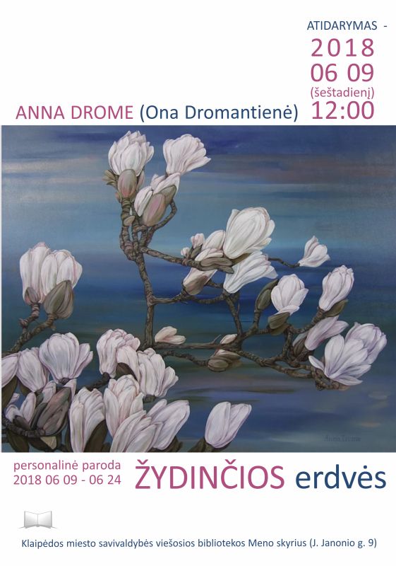 Birželio 9 d. 12.00 val. Klaipėdos miesto savivaldybės viešosios bibliotekos Meno skyriuje (J. Janonio g. 9) vyks Anna Drome (Ona Dromantienė) personalinės parodos „Žydinčios erdvės“ atidarymas.