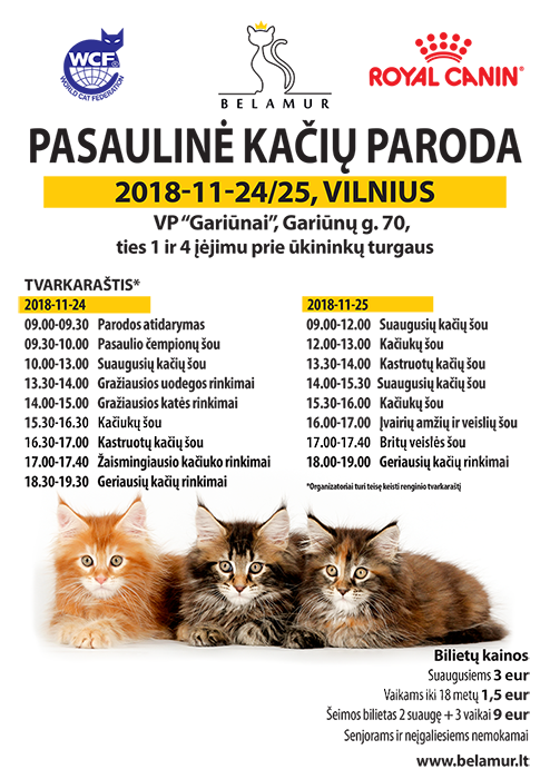 Pirmą kartą Lietuvoje Asociacija “Belamuro katės” organizuoja WCF Pasaulinę kačių parodą ir kviečia visus vilniečius ir miesto svečius pasigrožėti ir iš arčiau susipažinti su skirtingomis kačių veislėmis.