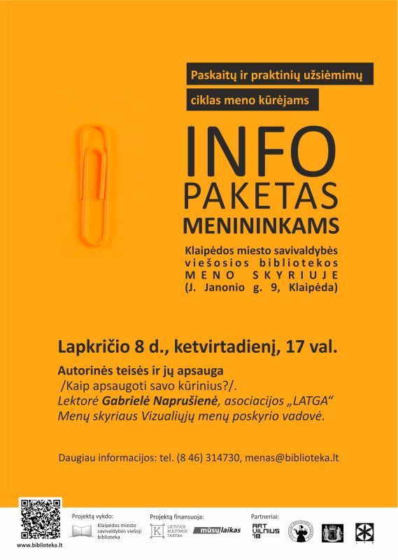 Lapkričio 8 d. 17.00 val. Klaipėdos miesto savivaldybės viešosios bibliotekos Meno skyriuje (J. Janonio g. 9) kviečiame į paskaitų ir praktinių užsiėmimų ciklą meno kūrėjams „Info paketas menininkams“.