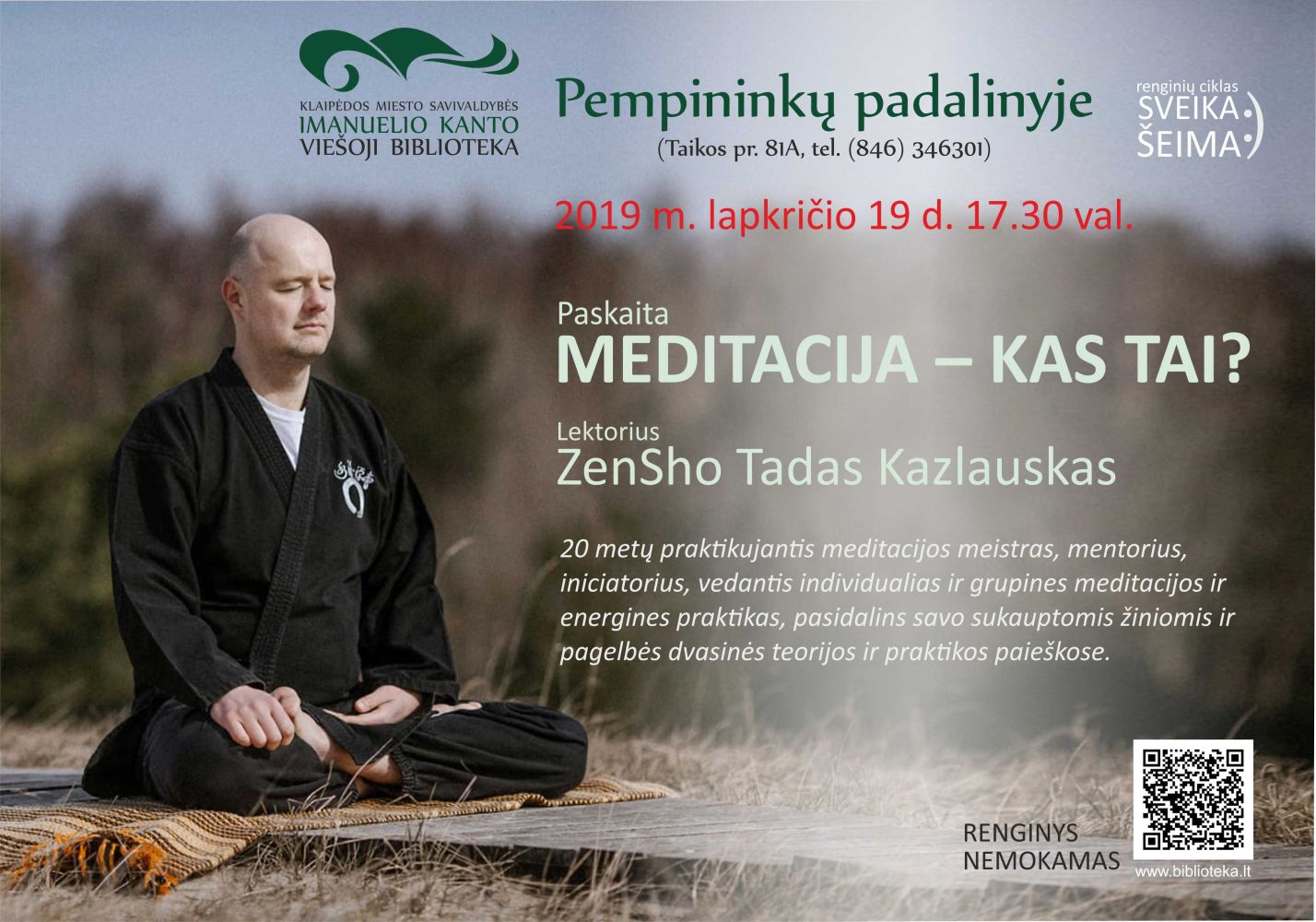 Lapkričio 19 d. 17.30 val. Pempininkų bibliotekoje (Taikos pr. 81A) kviečiame į paskaitą „Meditacija – kas tai?“. Socialiniuose tinkluose sklando daugybė mitų apie meditaciją: nuo apibrėžimo iki jos poveikio sveikatai. Paskaitos lektorius ZenSho Tadas Kazlauskas pasidalins savo sukauptomis žiniomis ir pagelbės dvasinės teorijos ir praktikos paieškose.