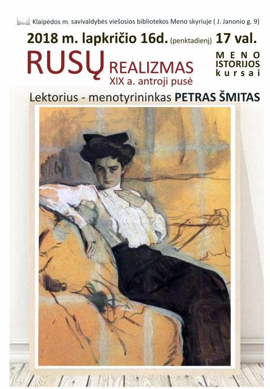 Lapkričio 16 d. 17.00 val. Klaipėdos miesto savivaldybės viešosios bibliotekos Meno skyriuje (J. Janonio g. 9) tęsiant meno istorijos kursus, kviečiame į lektoriaus-menotyrininko Petro Šmito paskaitą „Rusų realizmas XIX a. antroji pusė“.
