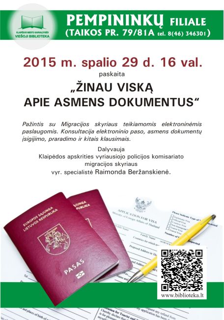 Paskaitos „Žinau viską apie asmens dokumentus” metu bus supažindinama su Migracijos skyriaus teikiamomis paslaugomis elektroninėje erdvėje, vyks konsultacija elektroninio paso, asmens dokumentų įsigijimo, praradimo ir kitais klausimais. Dalyvauja Klaipėdos apskrities vyriausiojo policijos komisariato migracijos skyriaus vyr. specialistė Raimonda Beržanskienė. Kviečiame dalyvauti!