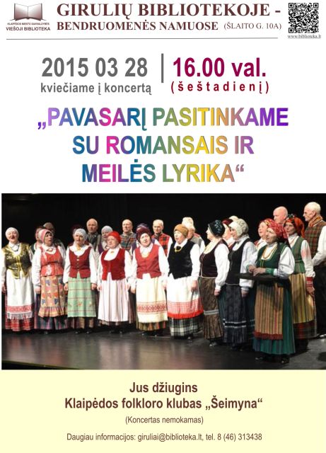 Kovo 28 d. 16 val. Klaipėdos miesto savivaldybės viešosios bibliotekos Girulių filiale (Šlaito g. 10A) kviečiame į koncertą „Pavasarį pasitinkame su romansais ir meilės lyrika”. Jus džiugins Klaipėdos folkloro klubas „Šeimyna”. Renginys nemokamas.Kovo 28 d. 16 val. Klaipėdos miesto savivaldybės viešosios bibliotekos Girulių filiale (Šlaito g. 10A) kviečiame į koncertą „Pavasarį pasitinkame su romansais ir meilės lyrika”. Jus džiugins Klaipėdos folkloro klubas „Šeimyna”. Renginys nemokamas.
