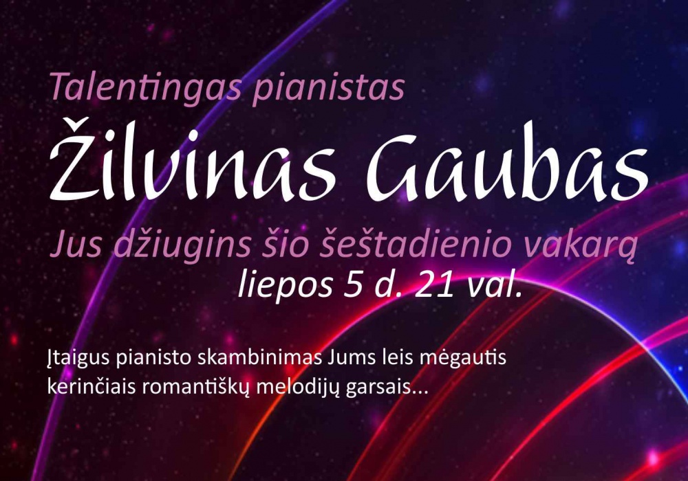 Jau šį šeštadienį Jus džiugins nuostabios pianisto Žilvino Gaubo melodijos… Apgaubkite savo mylimąjį (-ąją) dėmesiu, pamaloninkite vakariene žvakių šviesoje ir pasinerkite į nuostabias akimirkas dviese…