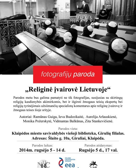 Rugsėjo 5 d. 17 val. Klaipėdos miesto savivaldybės viešosios bibliotekos Girulių filiale – bendruomenės namuose (Šlaito g.10a) atidaroma fotografijų paroda „Religinės įvairovės pažinimas Lietuvoje” (40 nuotraukų). Paroda bus eksponuojama iki rugsėjo 14 d.