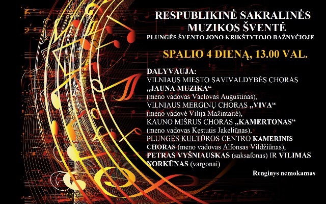 Po Šv. Jono Krikštytojo bažnyčios skliautais spalio 4-osios dienos popietę skambės pripažinimą Lietuvoje ir visame pasaulyje pelnę sakralinės muzikos šedevrai, o šventės puošmena taps bendri daugiau nei 200 choristų ir muzikų bendrai atliekami kūriniai. Plungės kultūros centras didžiuojasi, kad organizuodamas šį renginį prisideda prie ilgaamžių Plungės muzikinės istorijos tradicijų tęstinumo, atliepia augantį sakralinės muzikos poreikį bei šiuo renginiu pakiliai gali vainikuoti naujo 76-ojo kūrybinio sezono pradžią.