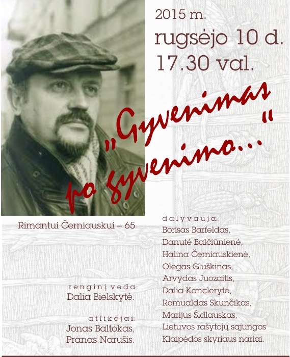 Rugsėjo 10 d. 17.30 val. Klaipėdos miesto savivaldybės viešoji biblioteka (Turgaus g. 8) kviečia į šiltą ir jaukų vakarą “Gyvenimas po gyvenimo”, skirtą Rimantui Černiauskui (65). Kartu su artimaisiais, draugais, kolegomis ir bičiuliais prisiminsime jo kūrybą, gyvenimo kelią, svarų įnašą dirbant Lietuvos rašytojų sąjungos Klaipėdos skyriaus pirmininku bei einant ilgametes mokytojo pareigas. Renginį ves Dalia Bielskytė. Muzikuos Jonas Baltokas ir Pranas Narušis.