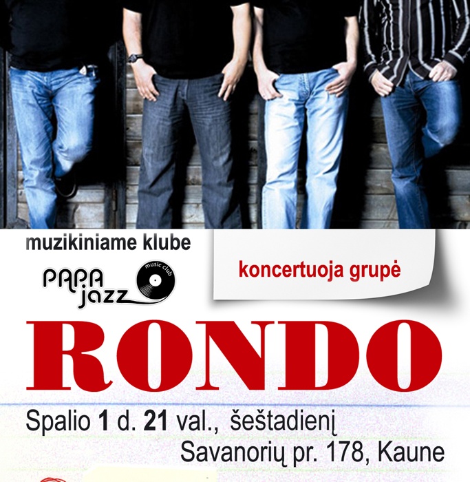 Sveiki.Kviečiame į muzikinį klubą “PAPA JAZZ”, Kaune. Šį vakarą koncertuos grupė Rondo. Bus nepamirštamas vakaras, todel kviečiame visus, norincius juos išgirti ir gerai praleisti laiką
