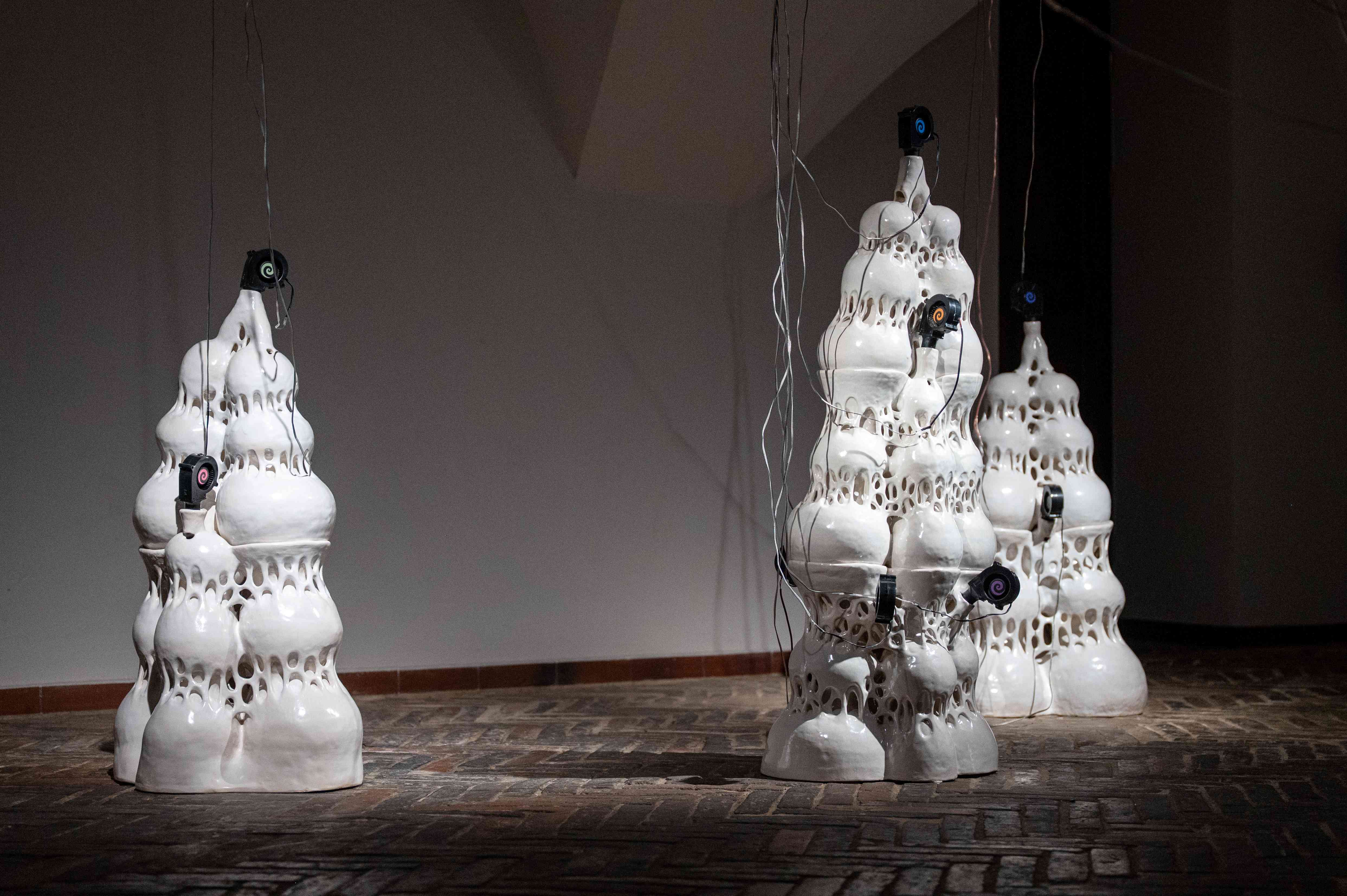 Elena Laurinavičiūtė ir Roma Salė – jaunosios Lietuvos tarpdisciplininio meno atstovės. E. Laurinavičiūtė kuria garso instaliacijas, tyrinėdama molio materialumo ir garso efemeriškumo sąveiką, o R. Salė – šviesos objektus, reflektuojančius erdvės atmintį ir istoriją. Parodoje menininkės nagrinėja garso, šviesos ir erdvės sintezę, kuri atskleidžia nematomas kaitos būsenas bei nestabilumo jausenas. Ekspozicijoje, atsižvelgdamos į kolektyvinę pastato atmintį, menininkės tyrinėja garso, šviesos ir erdvės sąveiką, jų poveikį žmogaus suvokimui. Unikali erdvės akustinė architektūra tampa neatsiejama instaliacijų dalimi, kurioje aidas formuoja gyvą garsinį kūną. E. Laurinavičiūtės garso objektai kuria aktyvią akustinę terpę – per juos girdima tai, kas įprastai nematoma: oro srautai, vibracijos, ritminiai judesiai. Tuo tarpu R. Salės šviesos laukai ekspozicijoje veikia kaip erdvės atminties nešėjai, nurodantys į pasikeitusią pastato paskirtį ir jo istoriją. Parodoje per retai pastebimų bangų sinesteziją menininkės kviečia patirti dažnai nepastebimas kaitos būsenas ir iš naujo įsiklausyti į pasaulį, kur materija, laikas ir atmintis susilieja nematomuose dažniuose.