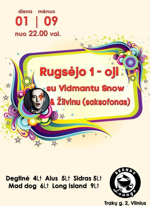 Vasarai prabėgus kaip akimirkai, vėl ateina ruduo. O su rudeniu kartu ir nauji potyriai bei nuotykiai. Rudenį pradedam gražia rugsėjo 1-osios švente. Vieniem ši šventė sukelia džiaugsmą, kitiems atvirkščiai. Tačiau reikia nepamiršti, kad nuo to niekur nepabėgsime. Kad ir kaip norėtumėm, kad vasara tęstųsi, reikia susitaikyti, kad ruduo vis vien ateis. Ir jis atėjo! Nepamirškite, kad ruduo atneš ne tik blogą orą, lietų ir darganą. Su rudeniu atkeliauja ir naujos linksmybės, nuotykiai, vakarėliai, įspūdžiai ir dar daugelį kitų dalykų. Kad tai įrodytumėm, rugsėjo 1-ąją švęskime itin linksmai ir nuotaikingai. Pasitinkant naująjį rudens sezoną Brandy Lounge baras Jus kviečia į išskirtinį vakarėlį, kurį Jums garantuos Vidmantas Snow & Žilvinas (saksofonas). Užvedanti muzika, gera nuotaika, draugai ir nesibaigiantys kokteiliai, kuriuos Jums garantuos Brandy Lounge kolektyvas! – Degtinė 4Lt; – Alus 5Lt; – Sidras 5Lt; – Mad DOg 6Lt; – Long Island 9Lt Nesikrimsk ir linksminkis!