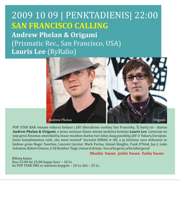 POP STAR BAR vienam vakarui keliaus į JAV liberalizmo sostinę San Franciską. Šį kartą tai – duetas Andrew Phelan & Origami, o jiems asistuos šiame mieste mokslus krimtęs Lauris Lee. Lietuvoje ne taip gerai žinomas amerikiečių house muzikos duetas turi labai daug pasiekėjų JAV ir Vakarų Europoje. Jiems komplimentus raitė „the most wanted” žurnalai DJMAG ir iDJ, o jų kūrinius savo miksuose ar laidose grojo Roger Sanchez, Laurent Garnier, Mark Farina, Inland Knights, Funk D’Void, Jay-J, Luke Solomon, Robert Owens, ir DJ Heather. Taigi, vienas iš dviejų – bus arba gerai, arba labai gerai!