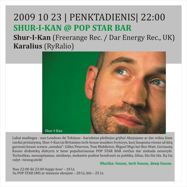 Labai madingas – nuo Londono iki Tokijaus – barzdotas pleibojus grįžta! Abejojame ar dar reikia šiam vardui pristatymų. Shur-I-Kan tai Britanijos tech-house muzikos švyturys, kurį liaupsina vienas už kitą garsesni house scenos „senukai”: Gilles Peterson, Tom Middleton, Miguel Migs bei Ben Watt. Geriausių Kauno diskotekų didvyris ir bene populiariausias POP STAR BAR svečias dar niekada nenuvylė. Techniškas, nenuspėjamas, atsidavęs, mokantis puikiai bendrauti su publika, šiltas, bla bla bla. Ką čia rašyt – tiesiog ateik!