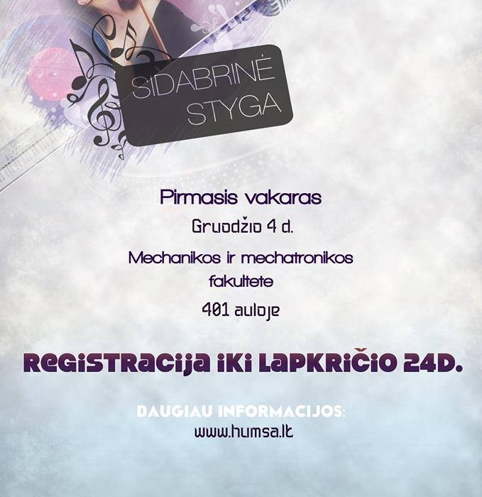 „Sidabrinė styga“ – tai kasmetinis gyvos muzikos festivalis, organizuojamas Kauno technologijos universiteto Humanitarinių mokslų fakulteto (KTU HMF) Studentų atstovybės „Humsa“. Festivalis skirtas tiek plačiai nežinomų atlikėjų pasirodymams, tiek visuomenėje pripažintiems muzikantams. Šiemet gyvos muzikos mėgėjai renginiu galės mėgautis dvi dienas. Pirmasis festivalio vakaras, vyksiantis gruodžio 4 d. Mechanikos ir mechatronikos fakultete, 401 auloje, bus skirtas jauniesiems muzikantams. Jo metu dalyviai atskleis savo talentus, o žiūrovai išrinks geriausią, kuris antrąjį vakarą galės pasirodyti kartu su jau visiems gerai žinomu atlikėju – Beissoul. Antrasis – finalinis vakaras vyks KTU III-jų rūmų (Laisvės al. 13) salėje, gruodžio 6d.