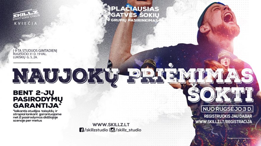 Po tvarkaraščio paskelbimo galėsite registruotis į devintojo SKILLZ šokių sezono naujokų grupes, adresu www.skillz.lt/registracija. Šokių pamokos prasidės Rugsėjo 3d. (pirmadienį). Kiek vieno stiliaus viena treniruote galėsite išbandyti NEMOKAMAI