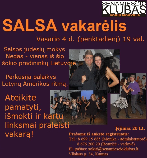 Šokių vakarėlis Lotynų Amerikos ritmu Vasario 4 d. (penktadienį) 19 val. Salsos ir ruedos judesių mokys Nedas – vienas iš salsos pradininkų Lietuvoje. Galėsite mėgautis gyvais perkusijos ritmais. Ateikite pamatyti, išmokti ir kartu linksmai praleisti vakarą! Jumis maloniai kviečia organizatorė, „Senamiesčio klubo“ vadovė Beatričė. Įėjimas 20 Lt. Prašome iš anksto registruotis. Daugiau informacijos: senamiescioklubas.lt