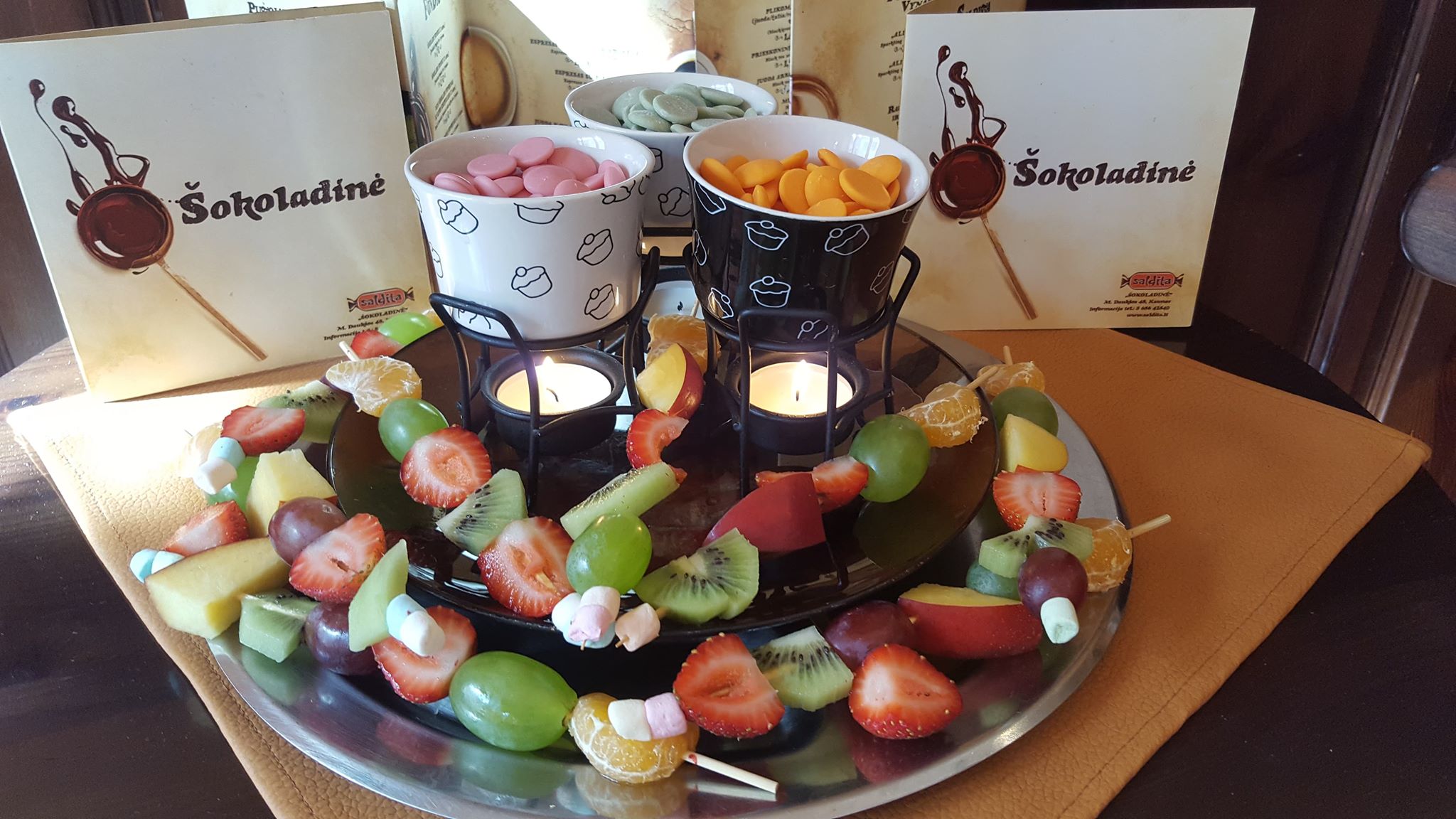 Šokolado fondiu šeimai, kuriame telpa 0,250 kg apelsininio, braškinio, citrininio šokolado ir šviežių vaisių ir zefyriukų vėrinukai.