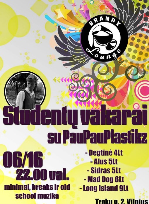 Mielas Studente, jauti artėjančių egzaminų sesijos pabaigą? Įkvėpk, užuodi linksmybių karštinę? Tad Tu esi būtent tas, kuriam ir bus skirtas ketvirtadienio vakaras. Atisplėšk nuo mokslų, pajusk vasaros gaivą, atsipalaiduok. Juk visa tai gali padaryti Brandy Lounge bare. Šį kartą prie linksmybių kvies PauPauplastikz (minimal, breaks ir old school). Barmenai taip pat neleis atsikvėpti, juk: – Degtinė 4Lt; – Alus 5Lt; – Sidras 5Lt; – Mad DOg 6Lt; – Long Island 9Lt Tad būk pasiruošęs įsilieti į linksmybių siautulį.
