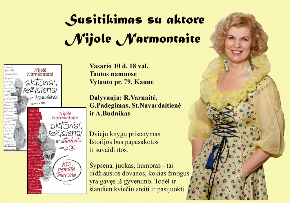 Vasario 10 d. 18 val. Kauno kultūros centre „Tautos namai” (Vytauto pr. 79) susitikimas su aktore Nijole Narmontaite.