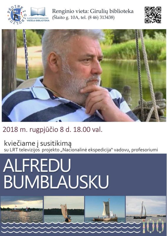 Rugpjūčio 8 d. 18.00 val. Klaipėdos miesto savivaldybės viešosios bibliotekos Girulių padalinyje (Šlaito g. 10A) „Pėdink į Girulius“ programoje – susitikimas su LRT dokumentinio ciklo „Nacionalinė ekspedicija“ (idėjos autorius – žurnalistas Edmundas Jakilaitis) vadovu profesoriumi Alfredu Bumblausku.