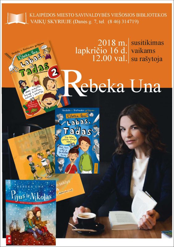 Lapkričio 16 d. 12.00 val. Klaipėdos miesto savivaldybės viešosios bibliotekos Vaikų skyriuje (Danės g. 7) – susitikimas su rašytoja Rebeka Una ir knygų mažiesiems skaitytojams pristatymas.