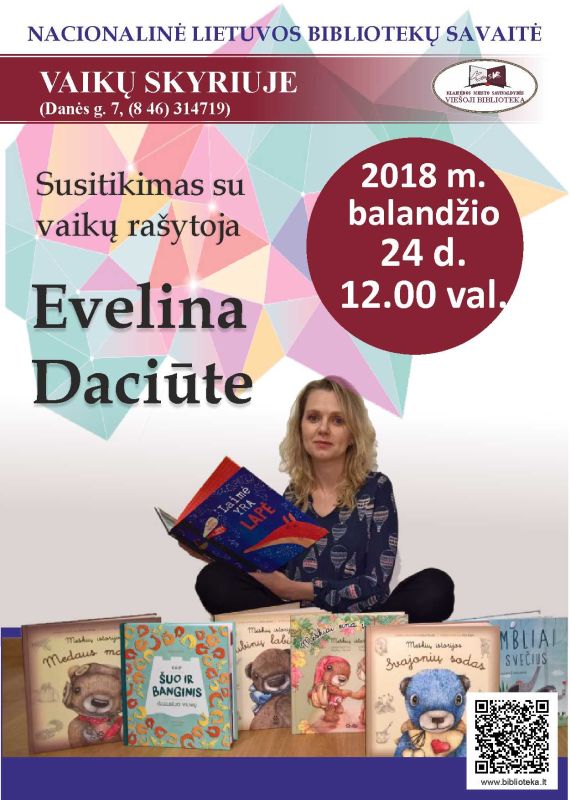 Klaipėdos miesto savivaldybės viešosios bibliotekos Vaikų skyriuje (Danės g. 7) kviečiame į susitikimą su vaikų rašytoja Evelina Daciūte.